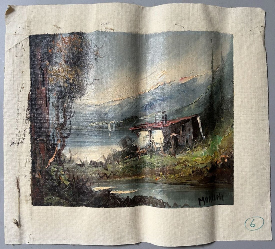 Oil on Canvas Landscape Painting, Signed by Manuni at Lower Right , and sight size 12.5”h x 10.5”w Condition: Good