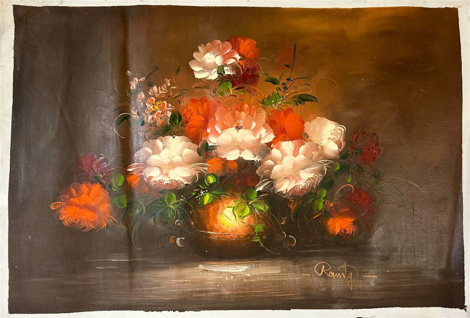 Oil on Canvas Still Life Painting, Signed by Randy at Lower Right, sight size 26.5”h x 37”w Condition: Good, sign of use and age