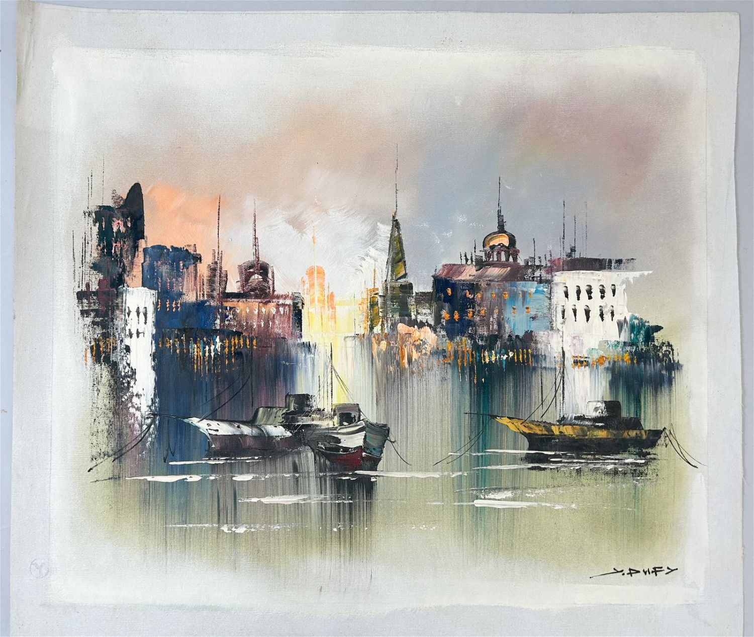 Oil on Canvas Cityscape Painting, Signed Y. Dufy at Lower Right, sight size 23”h x 24.5”w Condition: Good, sign of use and age