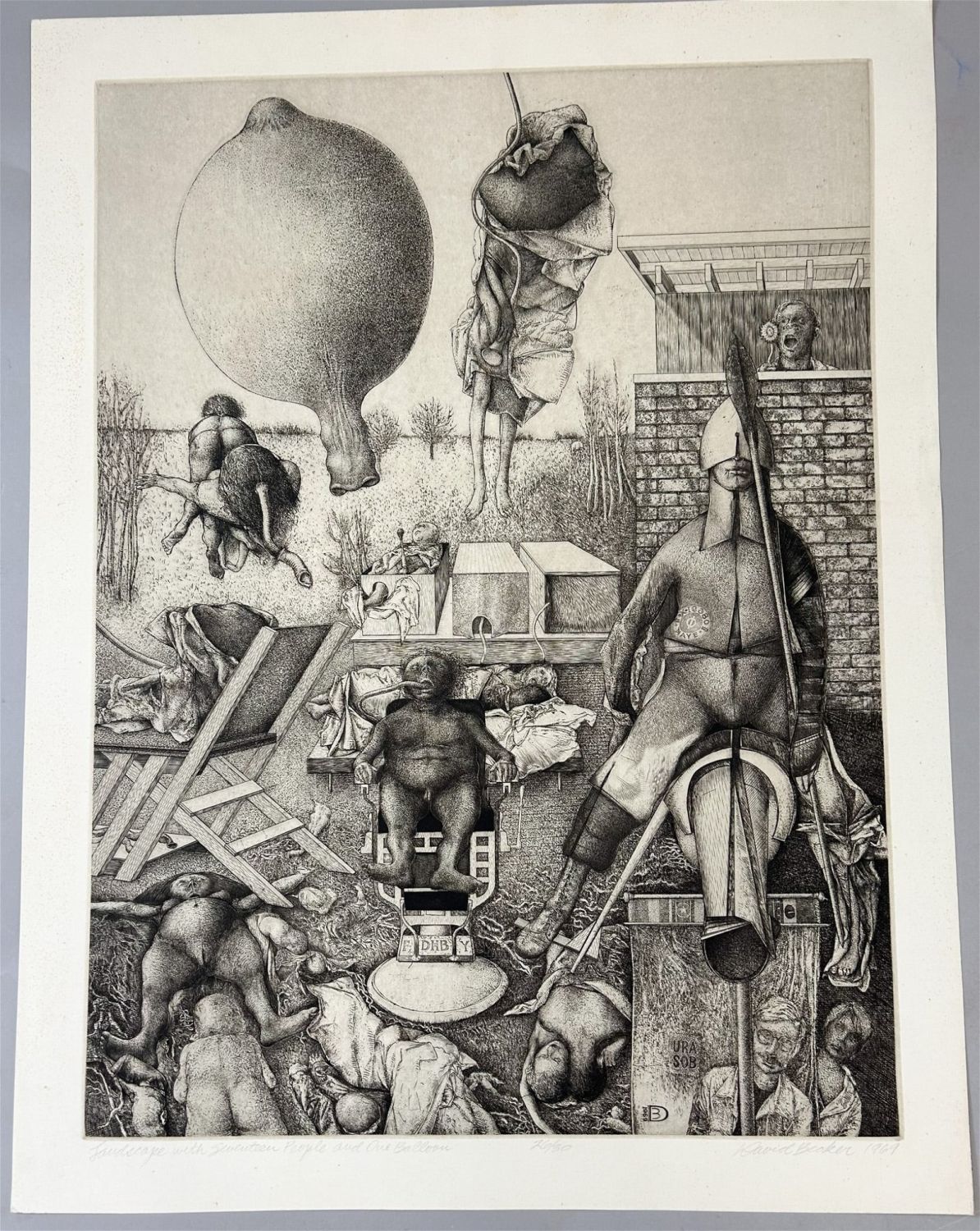 Etching, Pencil Signed by David Becker, 69 at Lower Right and Titled as ”Landscape with Seventeen People and One Ballon ”, sight size 27”h x 20.5”w Condition: Good