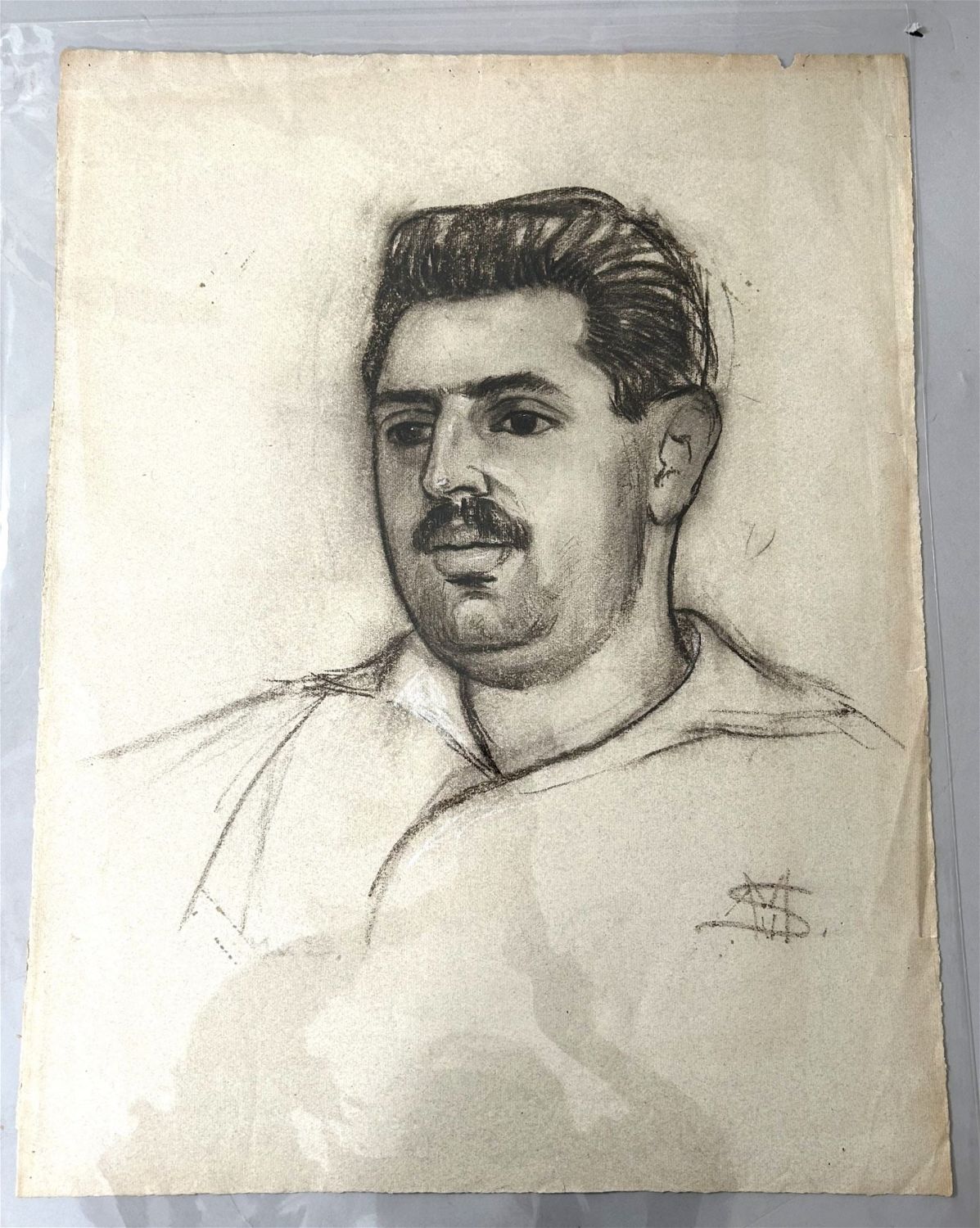 Pencil Drawing Man Portrait on Paper, Signed by S.M at Lower Right, sight size 24”h x 19”w Condition: Good