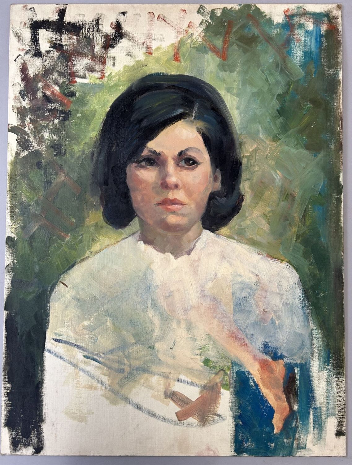 Oil on Canvas Board Woman Portrait, Unsigned, sight size 24”h x 18”w Condition: Good
