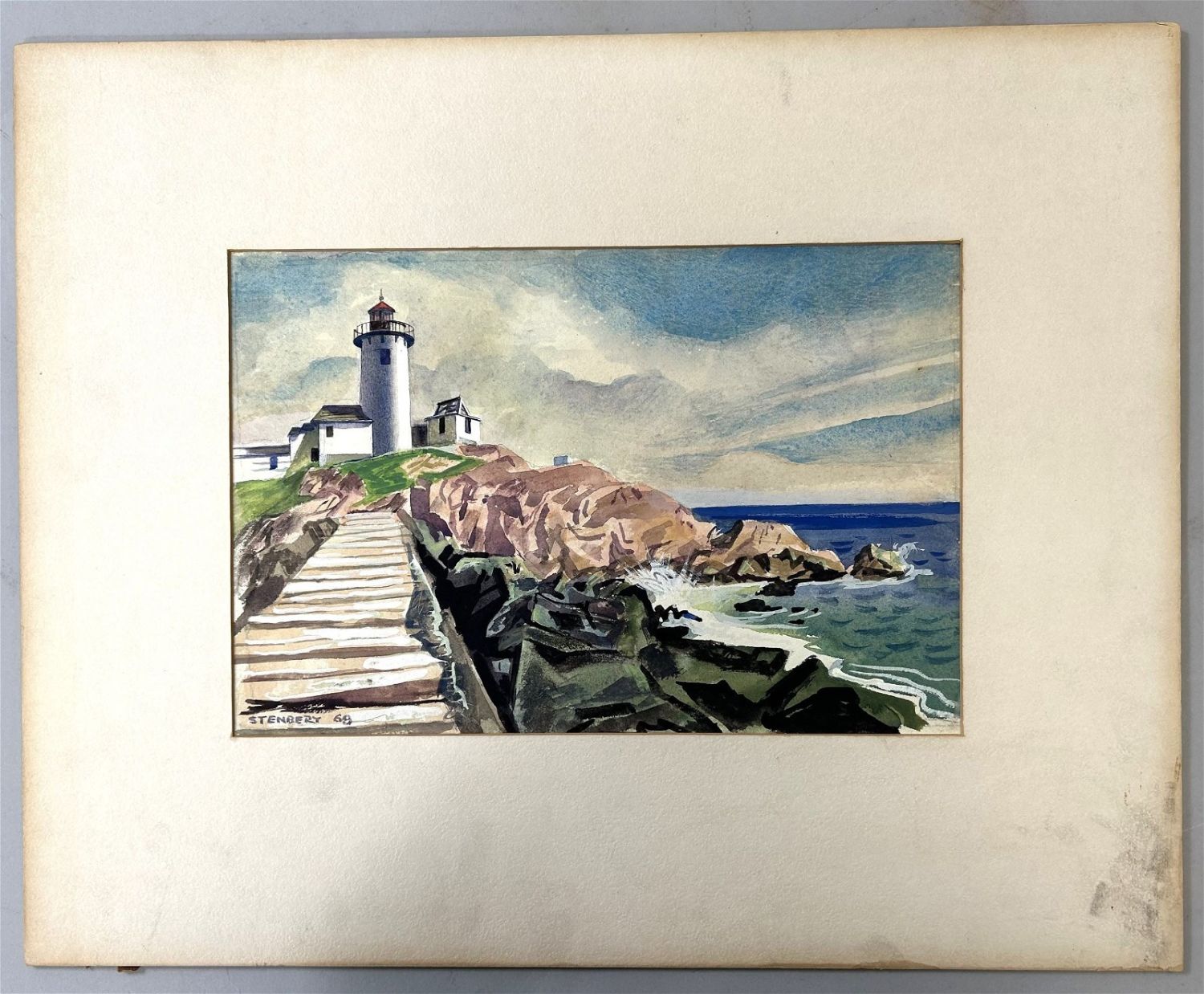 Watercolor on Paper Seascape Painting, Signed by Stenbery, 69 Lower Left, board size 13.5”h x 17”w and sight size 7”h x 10.5”w