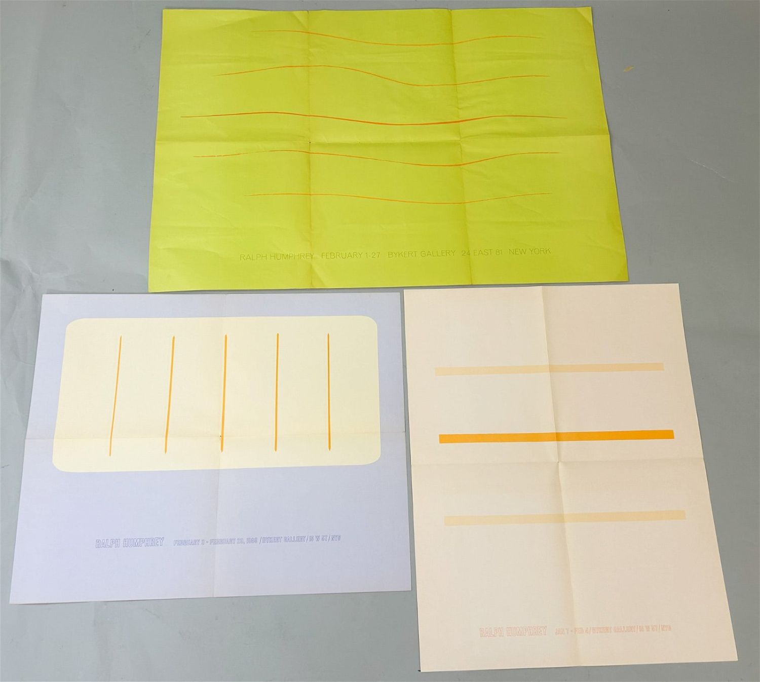 Vintage Exhibition Posters of Ralph Humphrey, Bykert Gallery, largest size 20”h x 29”w and smallest size 17”h x 21”w Condition: Good