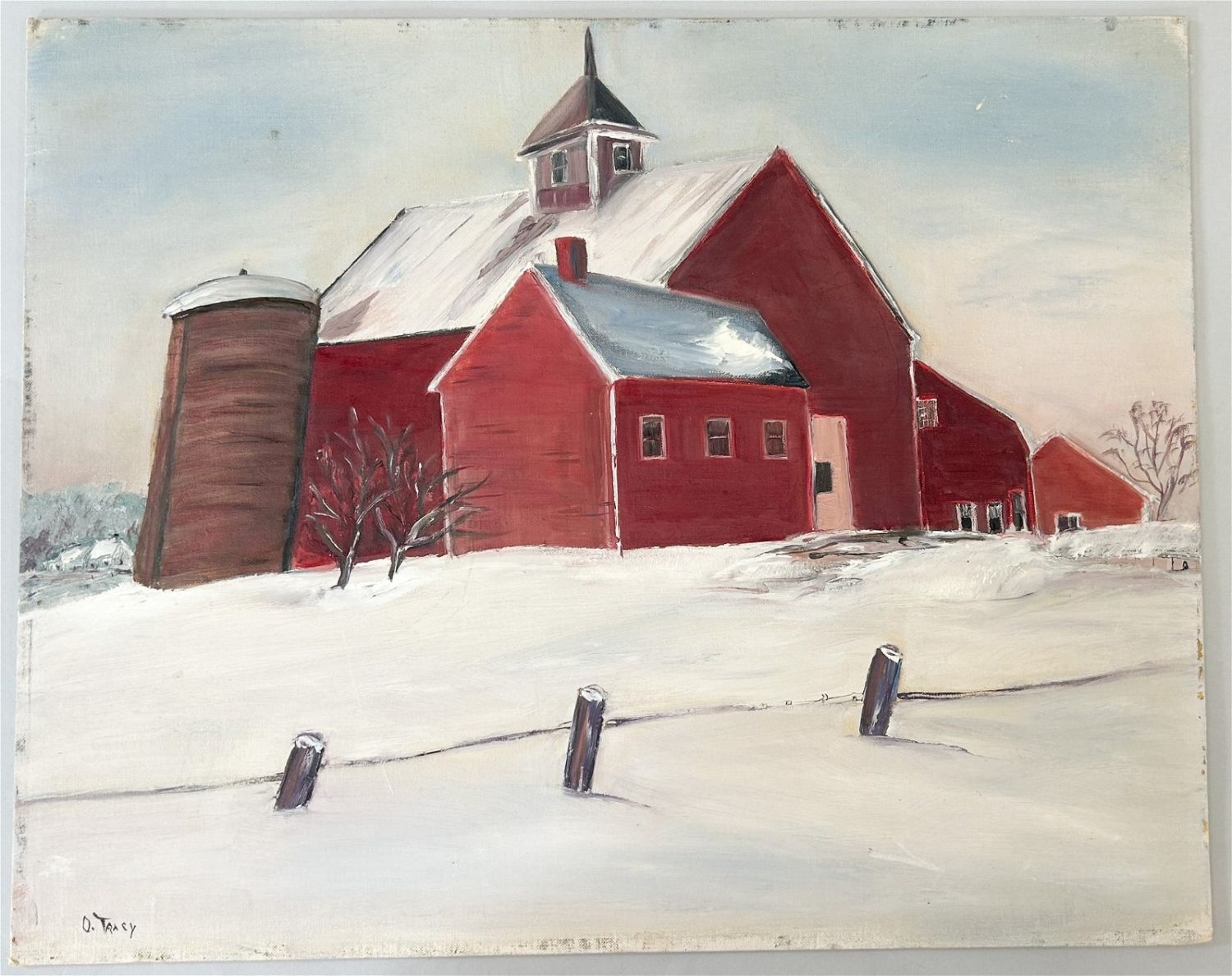 Acrylic on Canvas Board Farmscape in Winter Painting, Signed by O. Tracy at Lower Left, sight size 16”h x 20”w Condition: Good