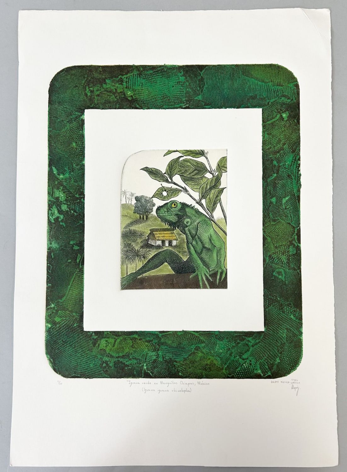 Pencil Signed by Jaime Keller Cortina, 1986 at Lower Right and Titled as”Iguana verde eu Manguitos Chiapas, Mexico”, sight size 19”h x 13.5”w Condition: Good