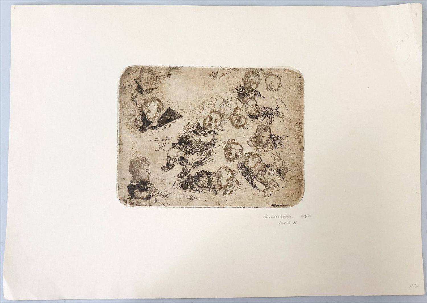 Antique Print, A. Welti, Titled as Kinderkopke, 1895, sight size 14”h x 20”w Condition: Good
