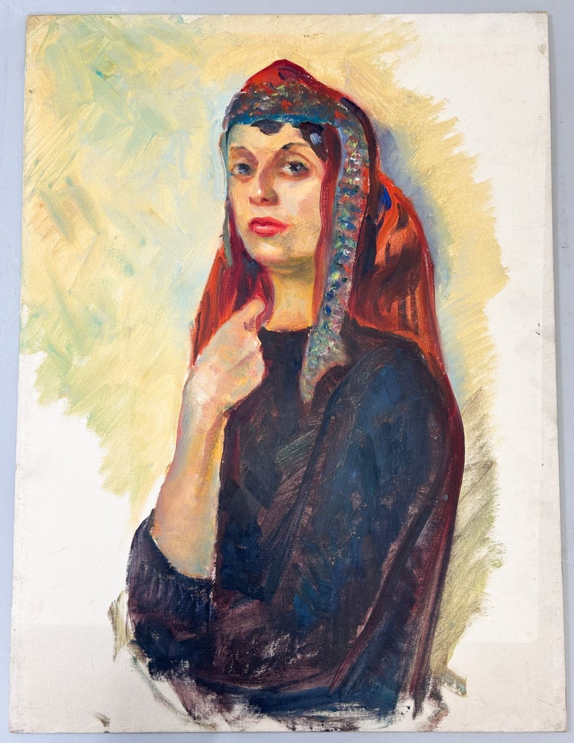 Acrylic on Canvas Woman Portrait, Unsigned, There are 5 nude woman drawings on verso, sight size 24”h x 18”w Condition: Good