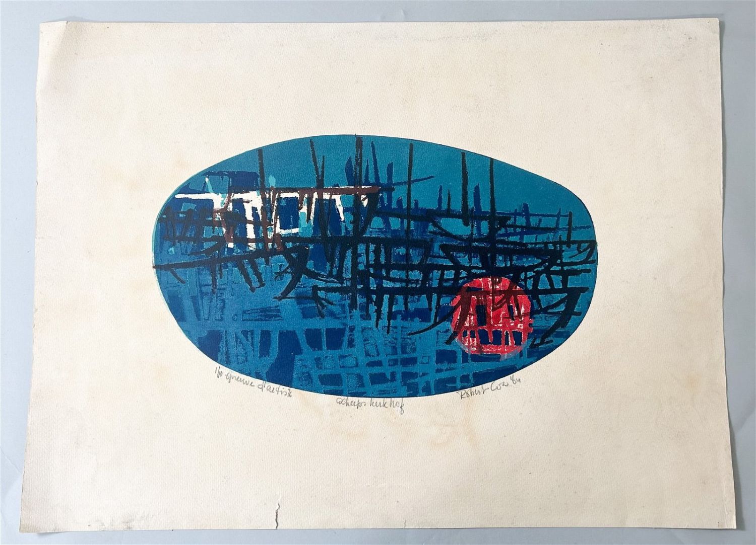Limited Abstract Lithography, 1 of 10, Pencil Signed by Robert Cox, 64, sight size 19.5”h x 27”w Condition: Good, sign of dirt