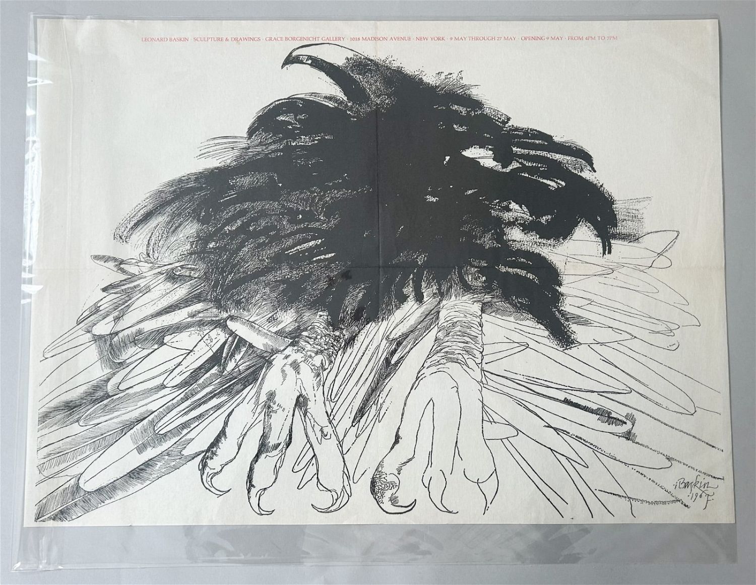 Leonard Baskin 1967 Exhibit Announcement Poster, Sculpture & Drawings, Grace Borgenicht Gallery, sight size 16”h x 22”w Condition: Good