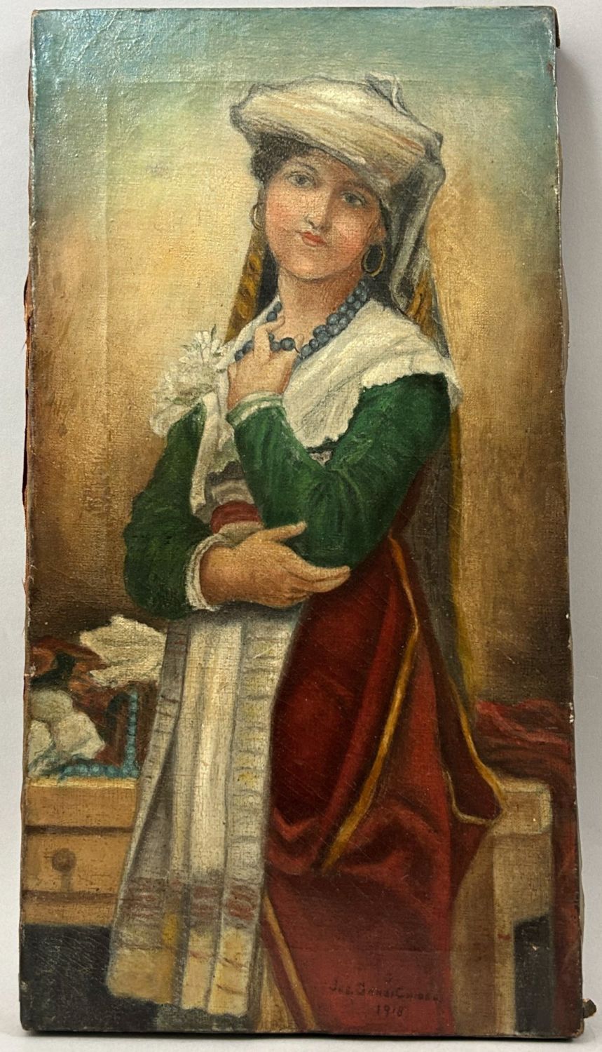 Antique Oil on Canvas Woman Portrait, Unsigned, canvas size 17"H x 9"W Condition: Good, sign of use and age