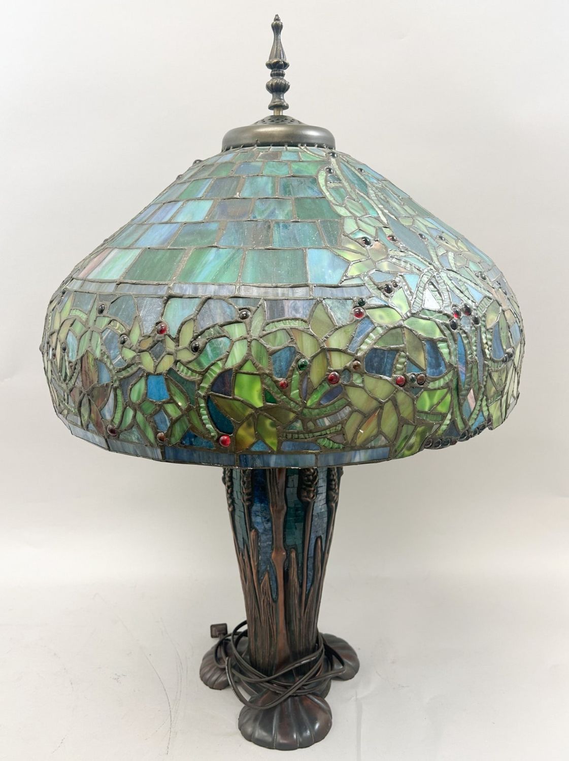 Art Nouveau Pattern Tiffany style contemporary lamp, cobalt blue rectangular glass pieces of stained glass is inserted into the body of lamps, approximate size 30.5"H x 21"W x 21”D
