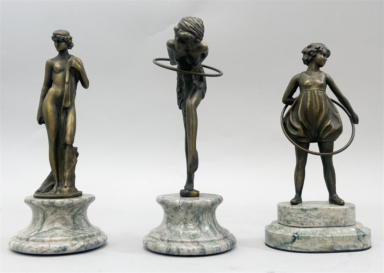 Group of (3) Bronze Sculptures on Marble Frame, Unsigned, largest size 9.5"H x 5.5"W x 4”D and smallest size 8.5"H x 4.5"W x 2.25”D