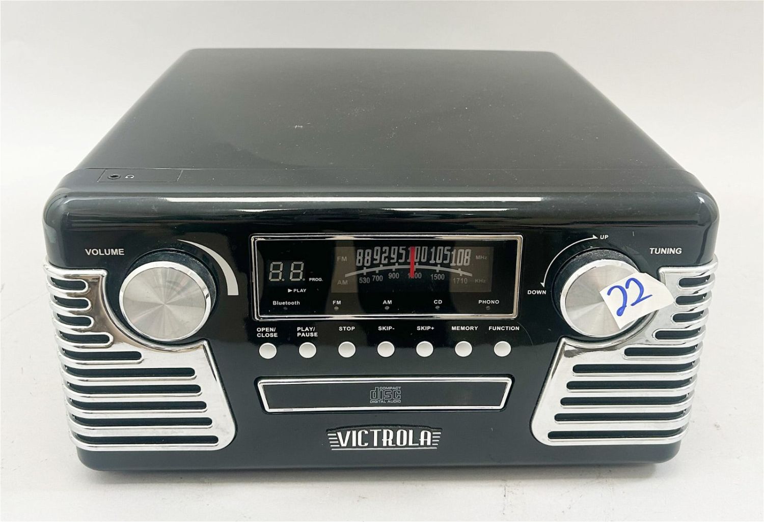Victrola Retro Bluetooth Record Player, approximate size 9.75"H x 11.75"W x 7.5”D Condition: Good, minor surface blemishes, not tested, sign of use
