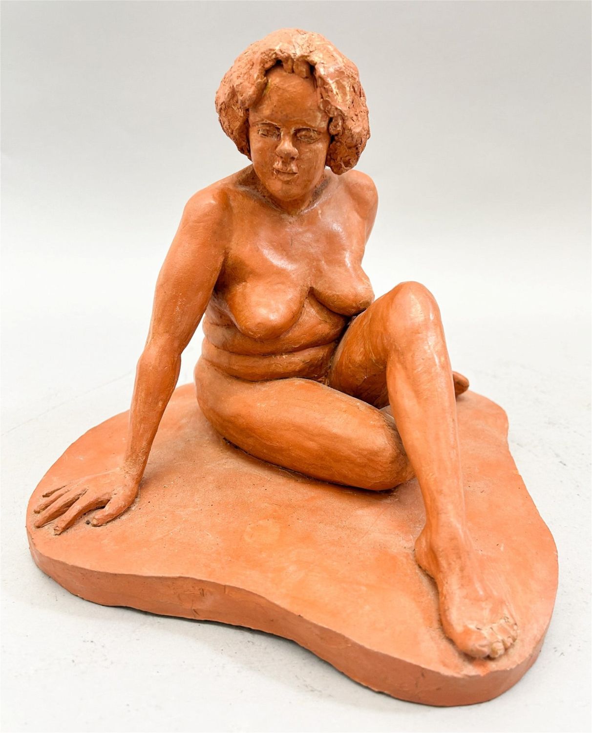 Terracotta Seated Nude Woman Sculpture, Signed by Theo, approximate size 8"H x 10.5"W x 9.5”D Condition: Good