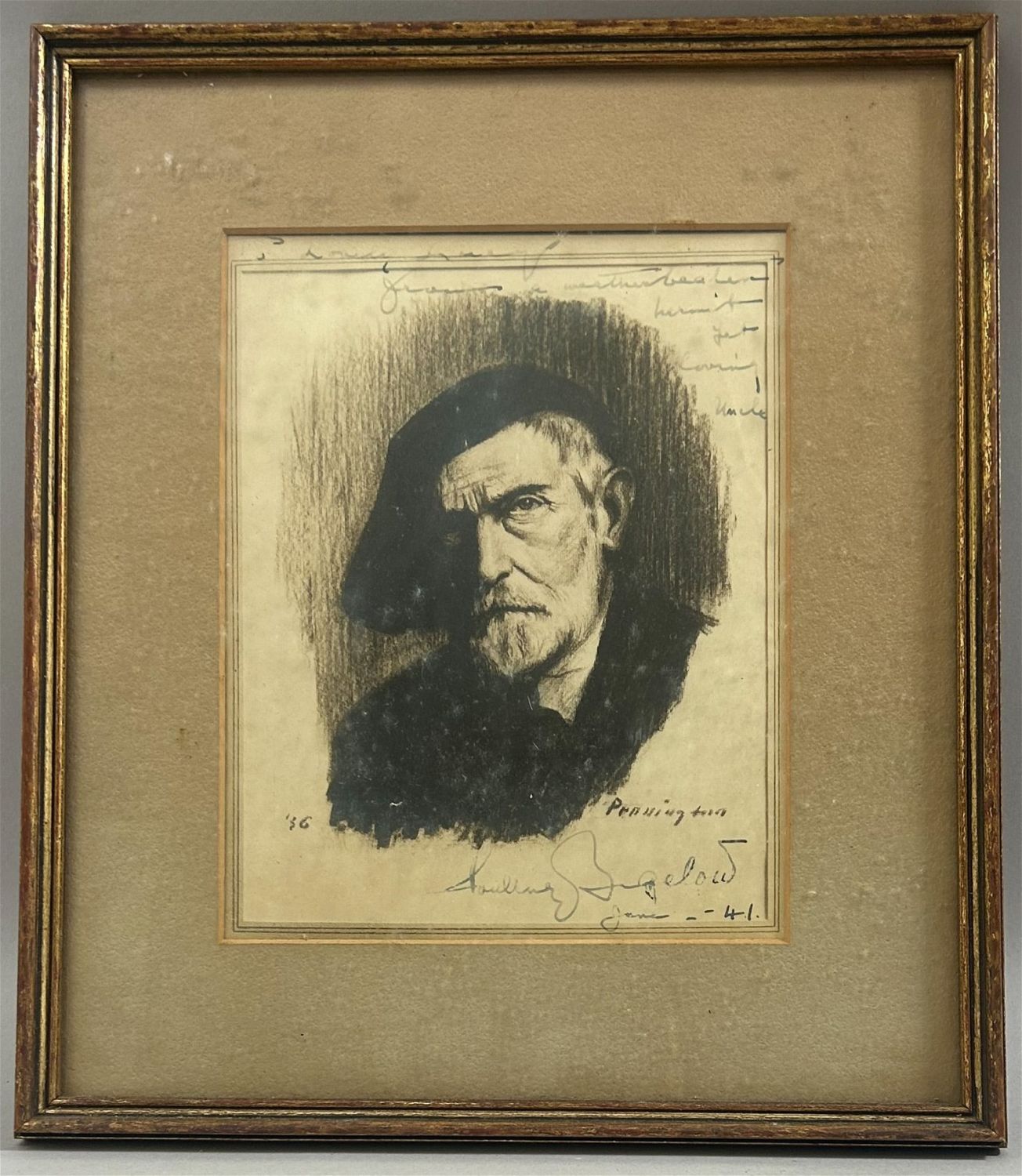 Pencil Drawing or Print of a Man, Illegibly Signed, frame size 13"H x 11.25"W and sight size 8"H x 6.5"W