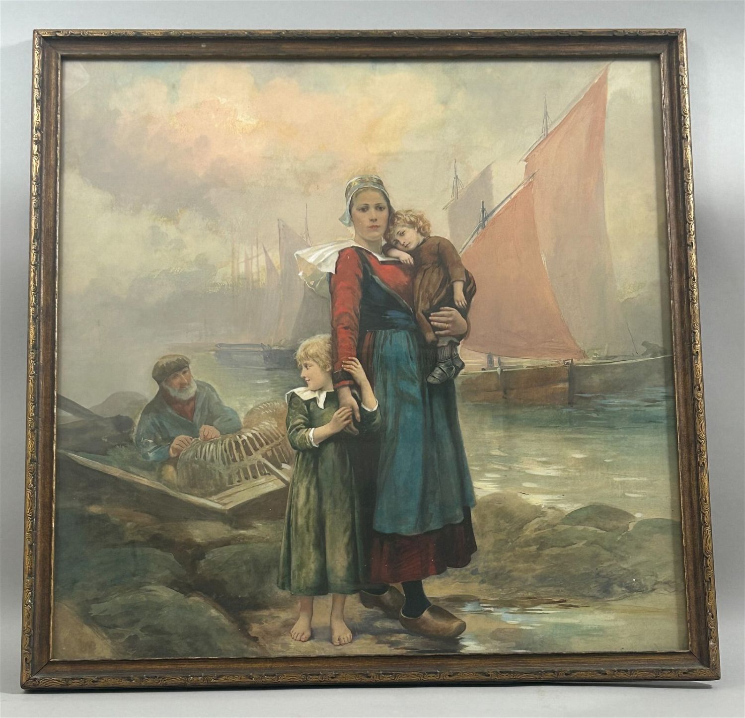 Framed Watercolor Harbor Scene Seascape with Family Portrait, Unsigned, frame size 23.5"H x 23.5"W and sight size 21.5"H x 21.5"W
