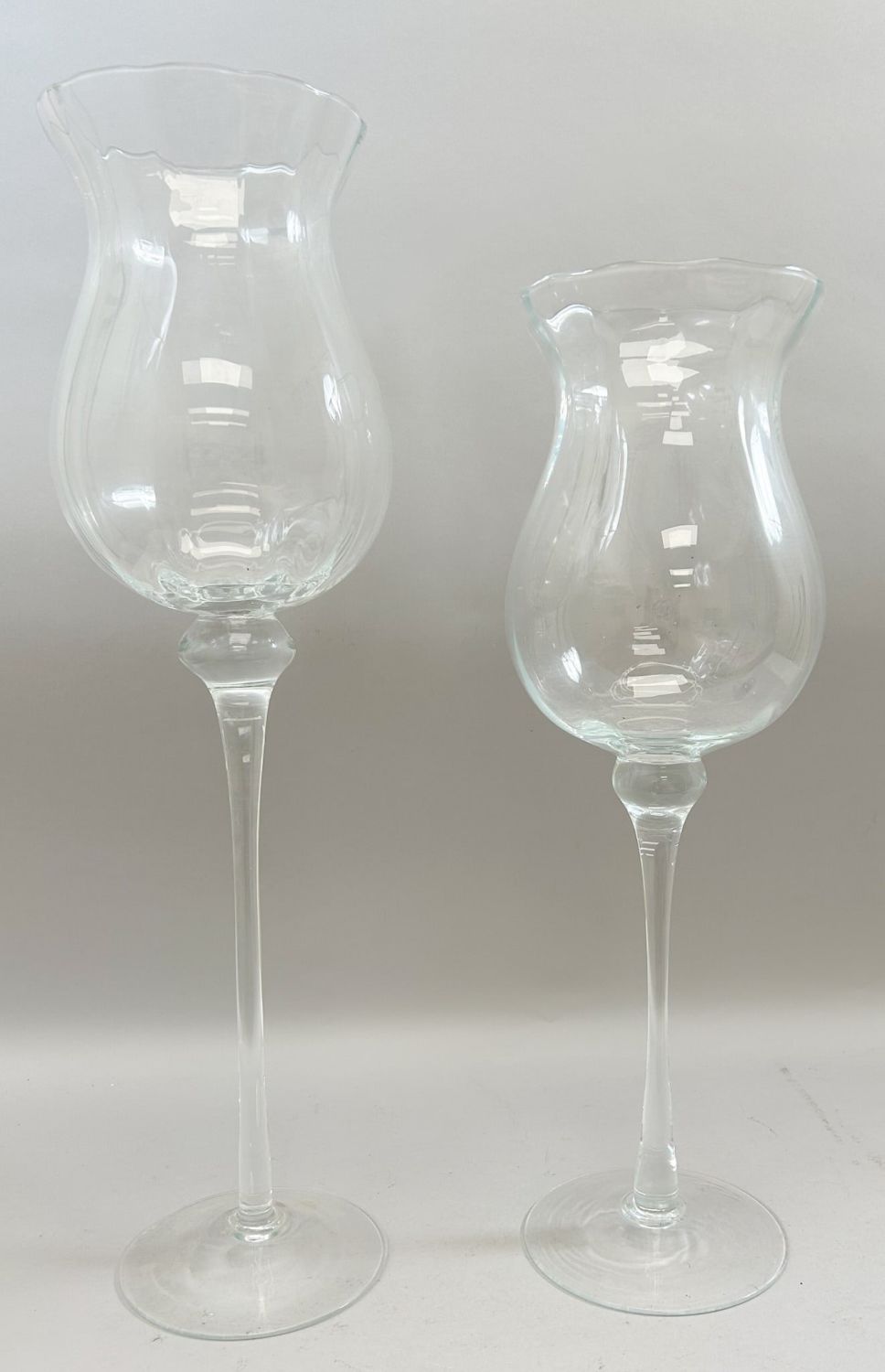 Vintage Large Blown Glass Goblets, largest 27.25"h x 8"w and smallest 21"h x 8"w Condition: Good, minor scratches, sign of use and age