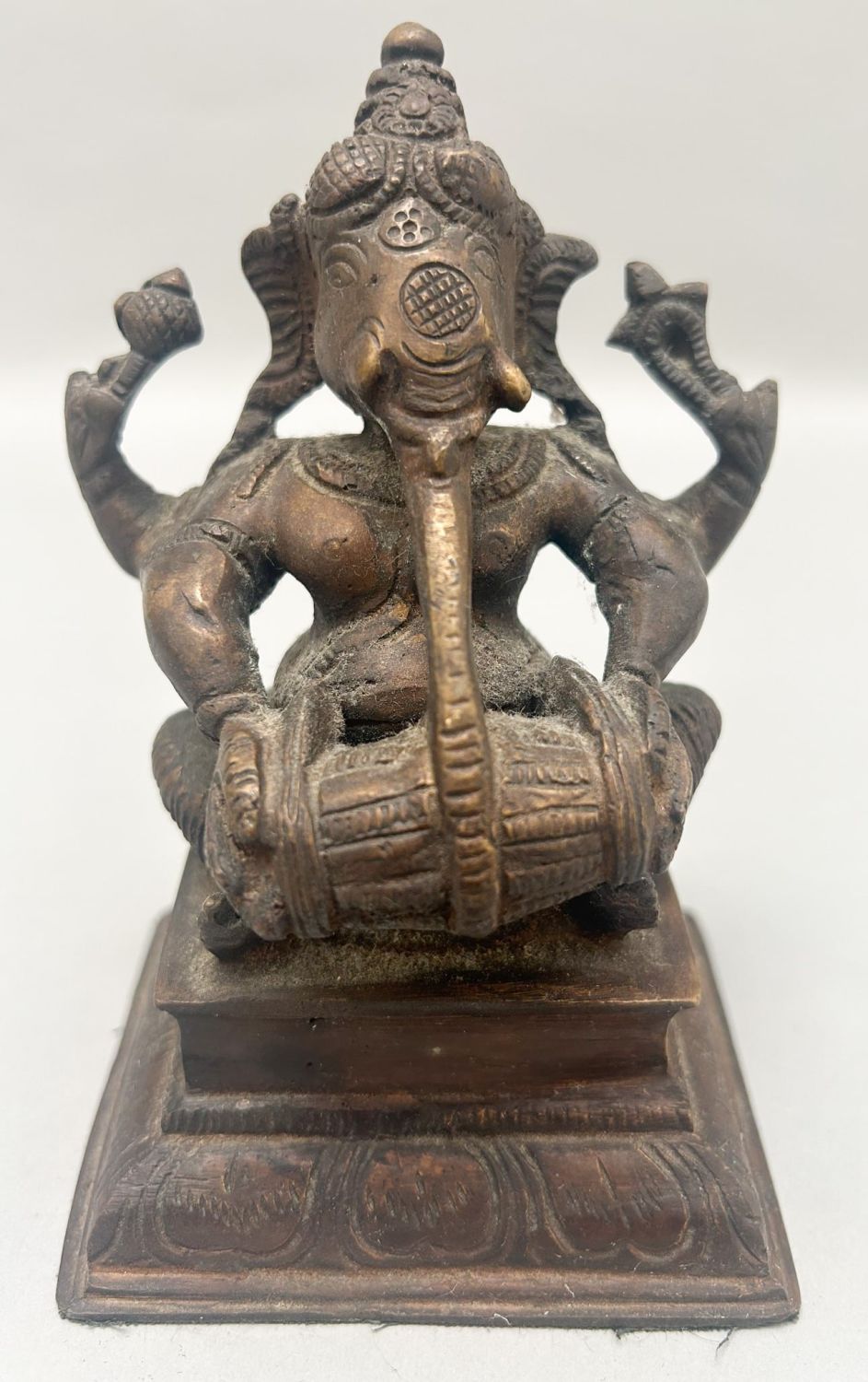 Vintage bronze Ganesha sculpture, 5.5"h x 3.5"w x 3"d Condition: Good, some scratches and scuffs, some dirt, some tarnish, signs of wear and age