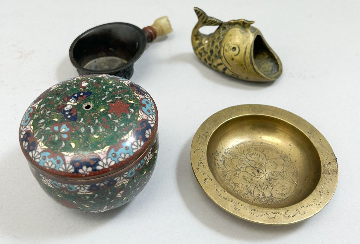 Group of (4) Vintage Chinese Small Round Cloissone Box, Bronze Plate and Saucer, and Bronze Pan Decorated with Wooden and Stone Handle, largest 3.25"h x 2.5"d and smallest 3.5"h x 2”w x 2"d