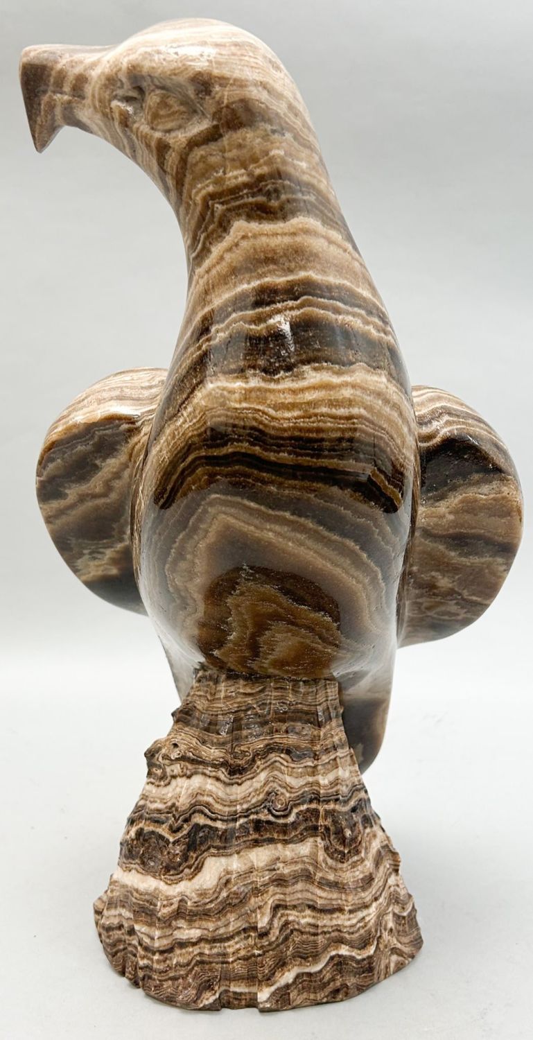 Vintage large chocolate calcite stone bird sculpture, unsigned, 15.5"h x 8.5"w x 9"d Condition: Good