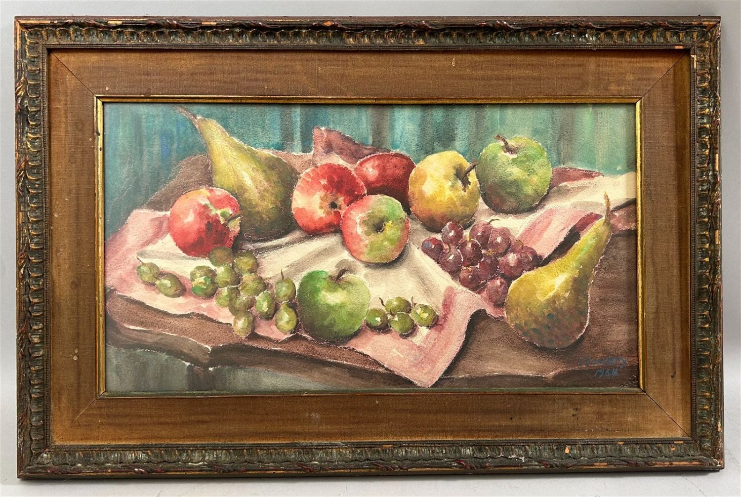 Framed Possibly Print or Watercolor Still Life with Apples, Pears, and Grapes, Signed by I. Donskoy, 1964, frame size 16.25"H x 25.25"W and sight size 10.25"H x 19.25"W