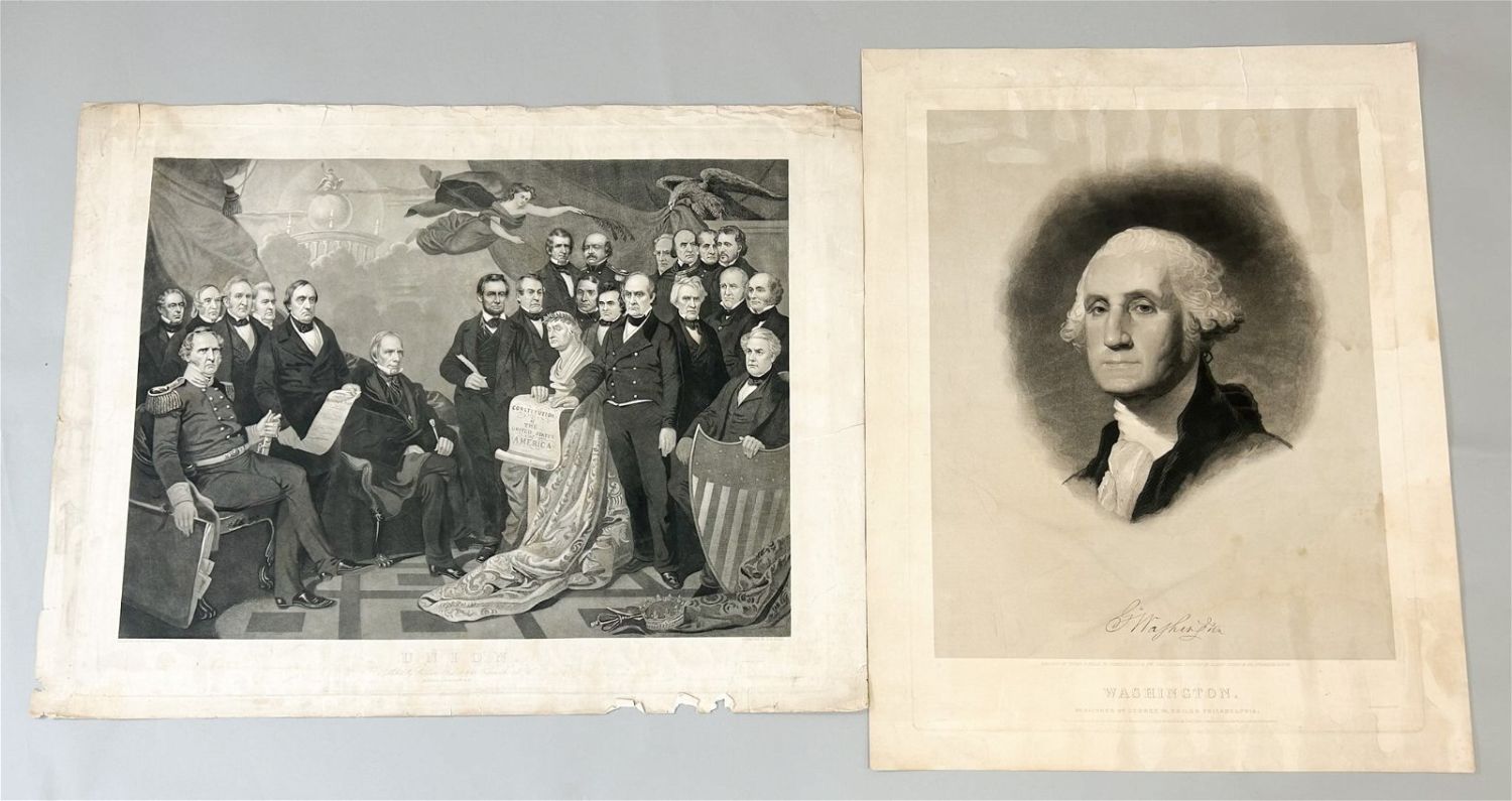 Group of (2) Antique Prints, Christian Schuselle, ” Wahington Irving and His Literary Friends at Sunnyside” and George Washington Portrait, largest approximate size 32"H x 25"W and smallest approximate size 29.75"H x 23"W