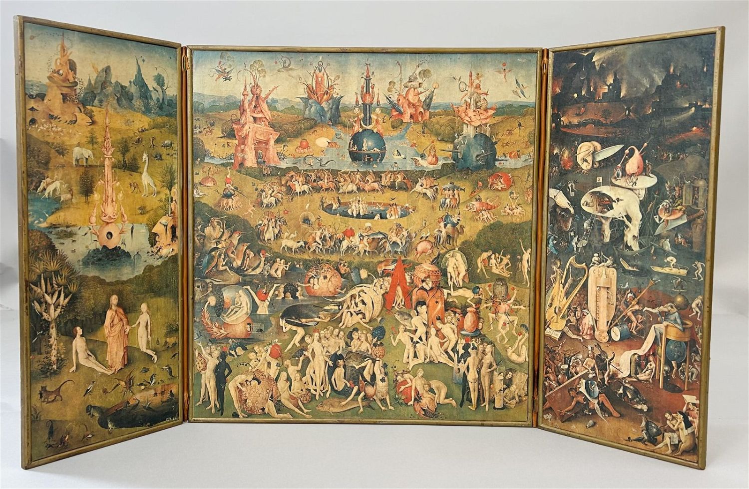 Vintage Garden of Earthly Delights Triptych Print on Wood Panel, After Hieronymus Bosch, Netherlands, ca.1450-1516, approximate size 22"h x 40"w