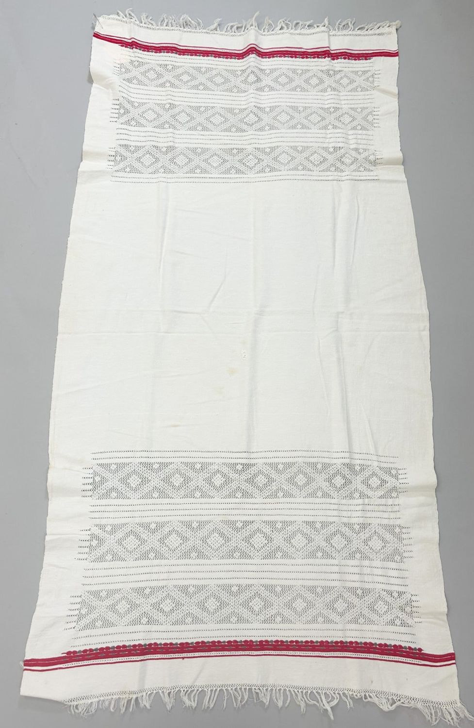 North African cotton textile, with openwork and red and silver-grey edging, mid-20th century, 54" x 27"