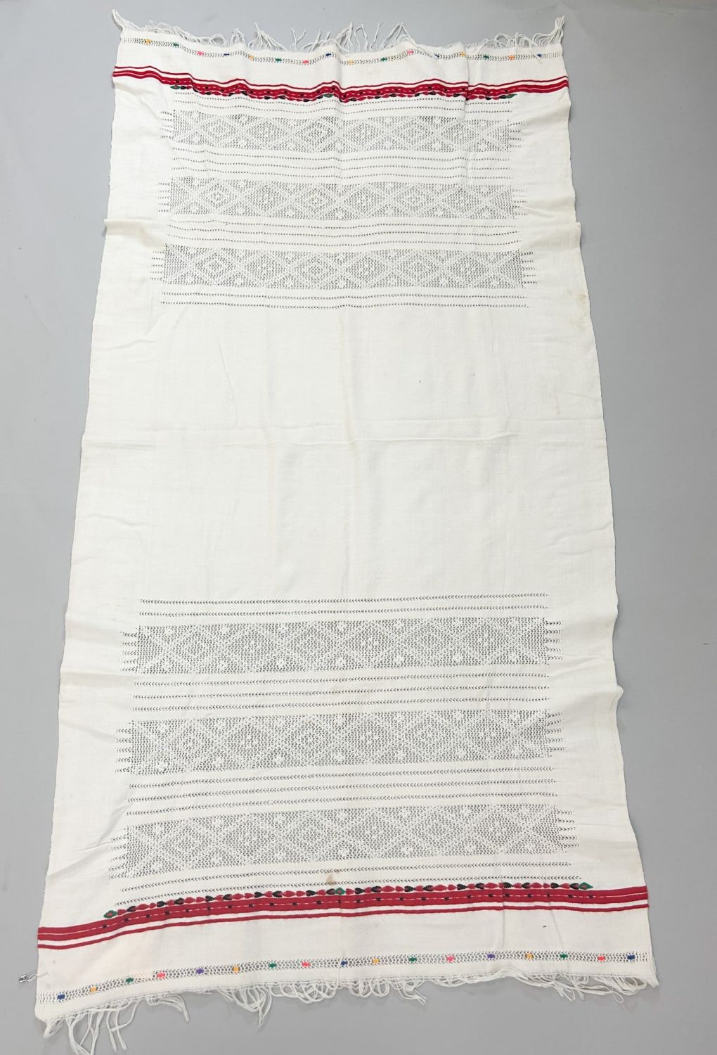 North African cotton textile, with openwork, red, black and green band and yellow, blue, green, orange and pink enbroidery to ends, mid-20th century, 55" x 29"
