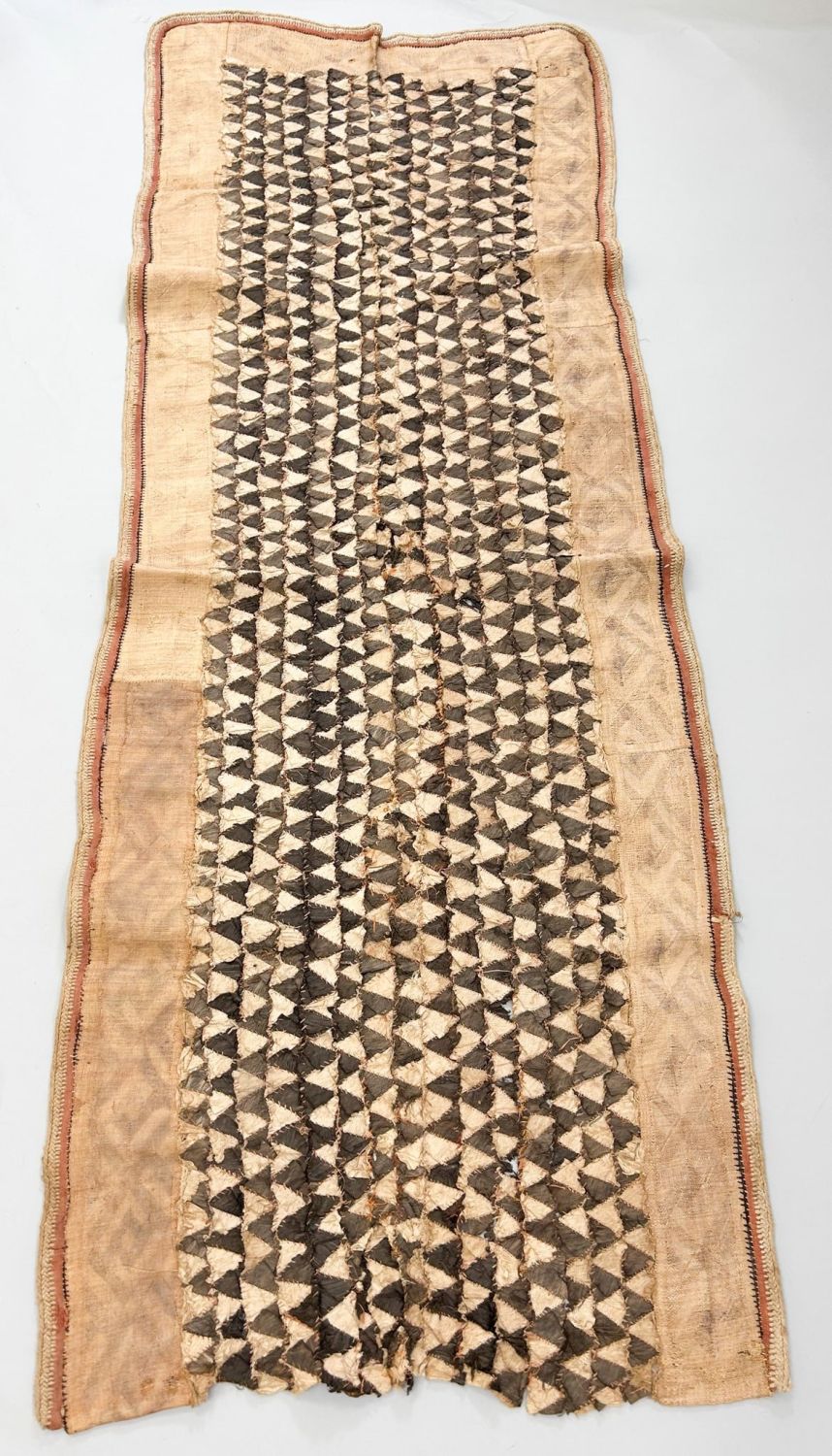 Kuba raffia skirt, with central panel of what appears to be barkcloth triangles likely first half of the 20th century, Democratic Republic of the Congo, Central Africa 63" x 23"