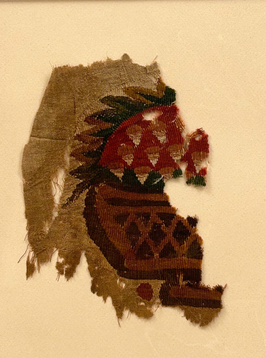 3rd – 10th Century Coptic textile fragment, geometric design in red, green, brown and undyed fabric, Egypt, North Africa. Approximate size 8" x 6" . Matted.