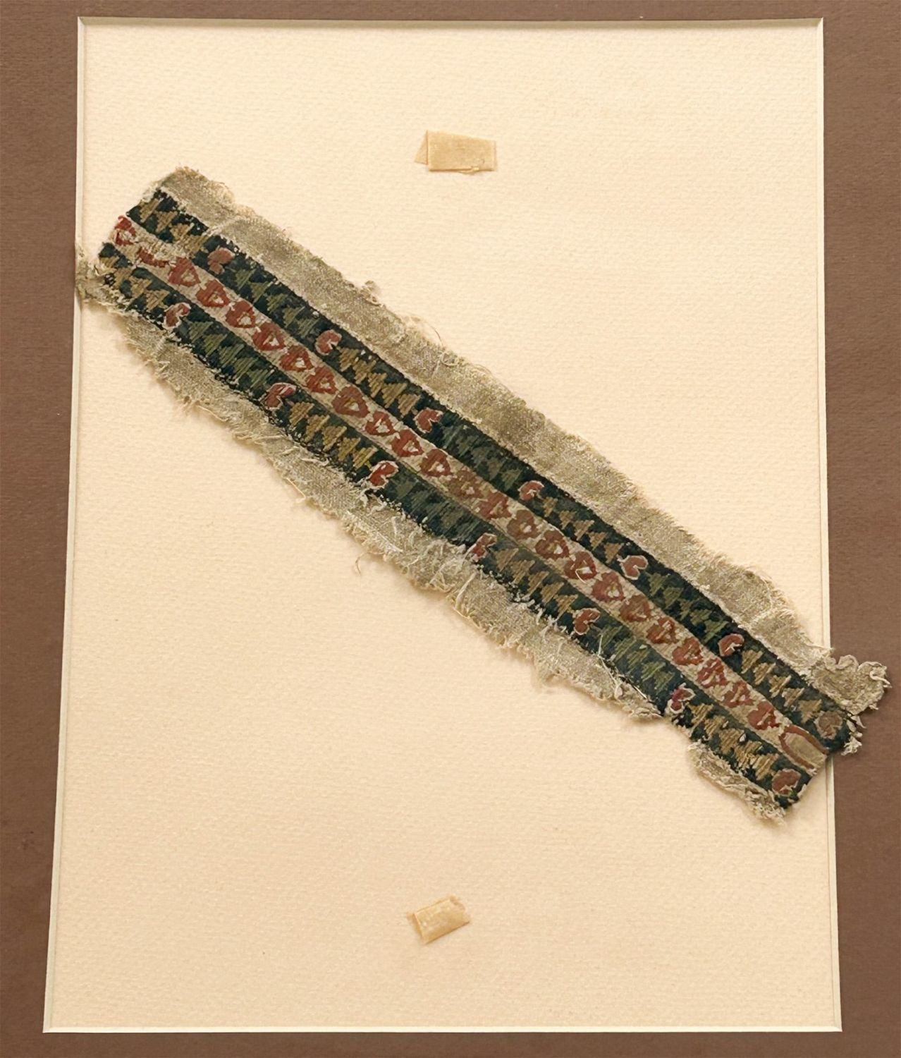 3rd – 10th Century Coptic textile fragment, narrow band form, with geometric patterns in triangular and spade-shaped forms, in indigo, green, red and yellow, linen, Egypt, North Africa. Approximate size 10" x 2.5". Matted.