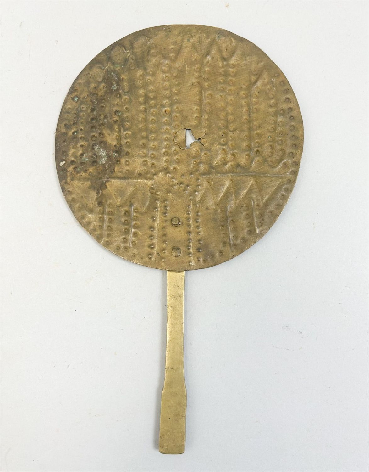Copper alloy fan, possibly Yoruba, Nigeria, West Africa. Approximate size, 9.75" long, 5.75" diameter,
