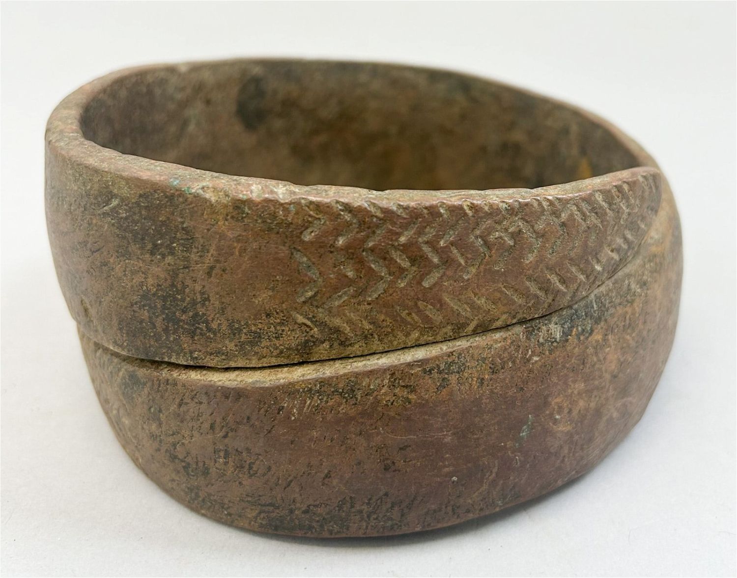 Copper alloy bracelet form currency, Kuba peoples, Democratic Republic of the Congo, Central Africa. Approiximate size, 5.5" diameter, 2.75" high.