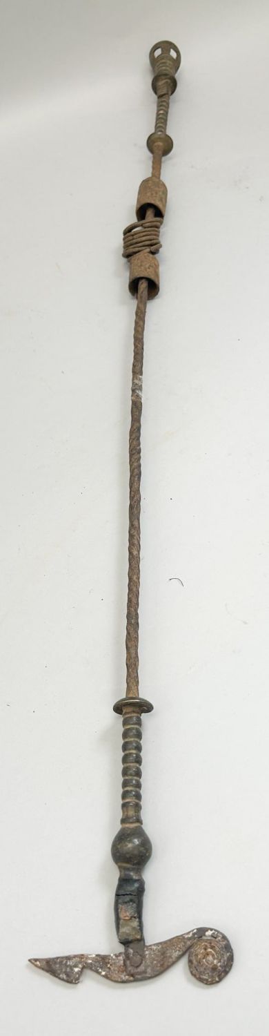 Forged iron staff, with central rings and tubular forms, chameleon finial, West Africa. Approximate size, 33.5" long.