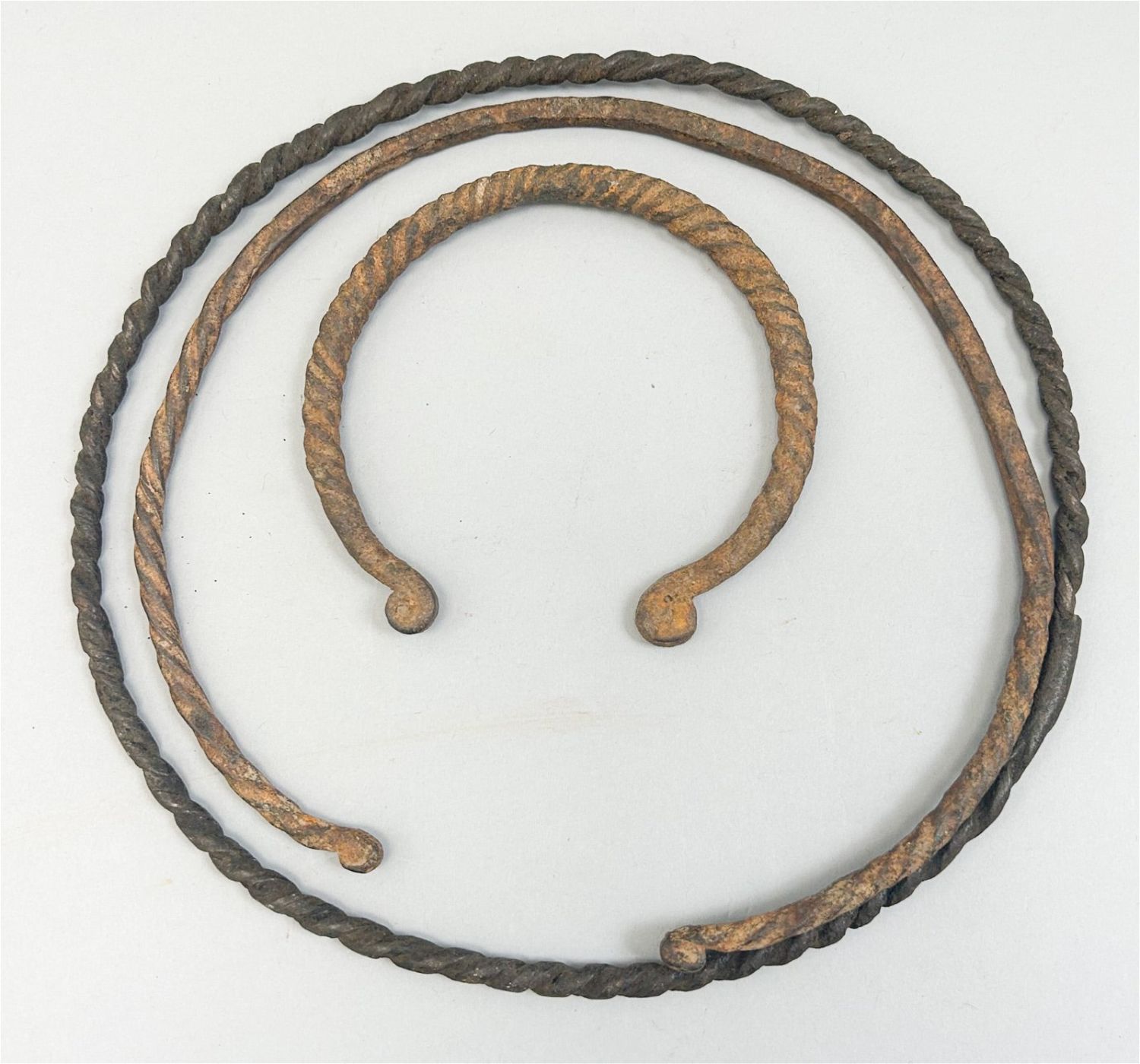 Three forged iron currency pieces, in twisted form, torque, bracelet and necklace formats, West Africa. Approximate size, 8" diameter (largest piece).