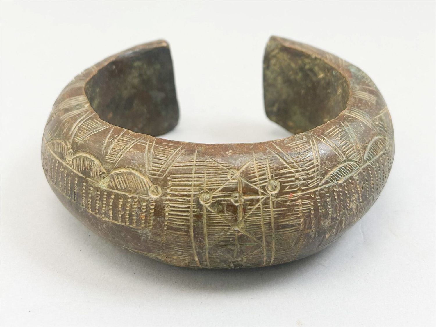 Copper alloy bracelet form currency manilla, West Africa. Approximate size, 4.5" diameter.