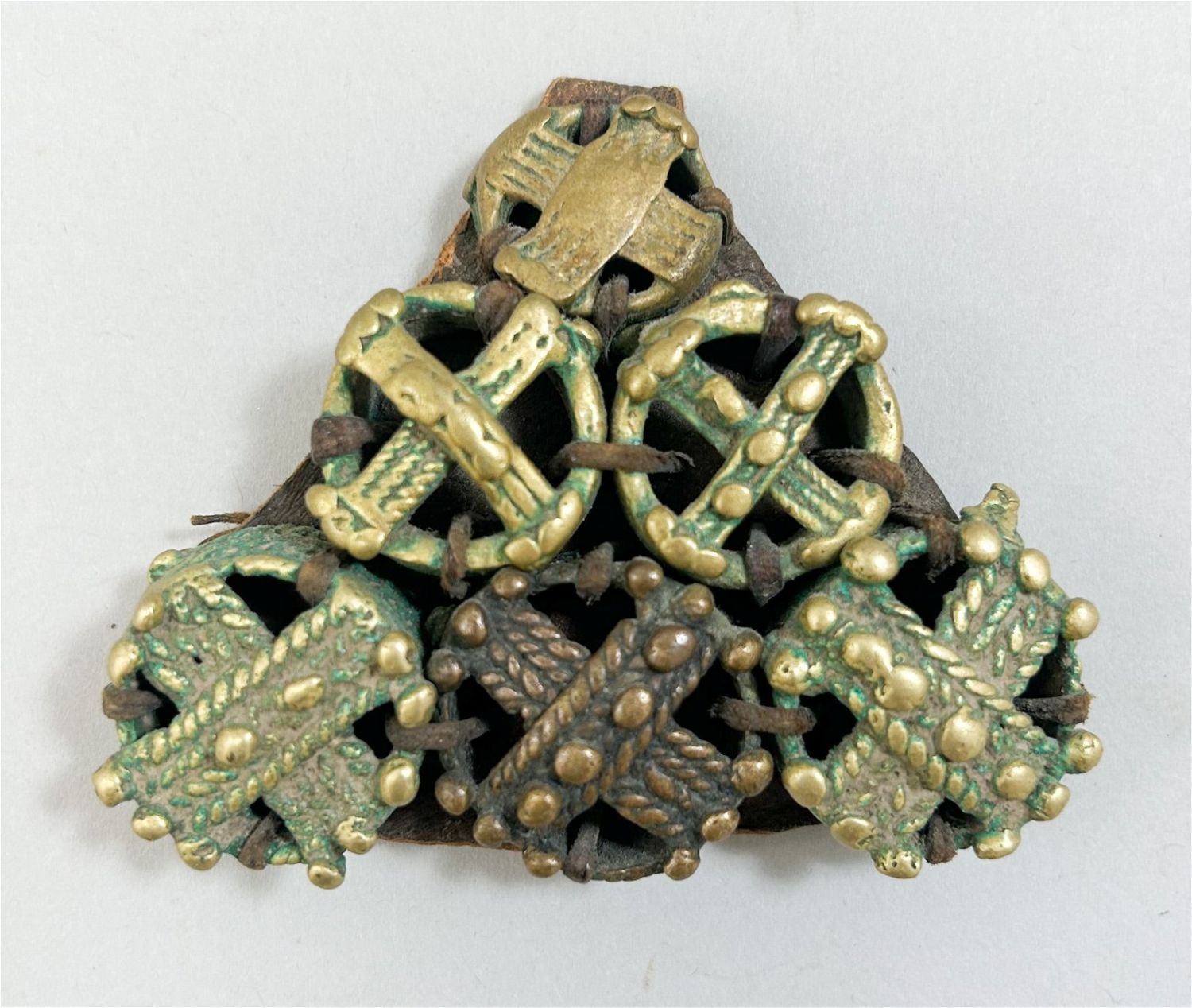 Dogon cast bronze and leather amulet, Dogon culture, C19th or first half of 20th, Mali, West Africa. Size 3" x 3" x 0.5".