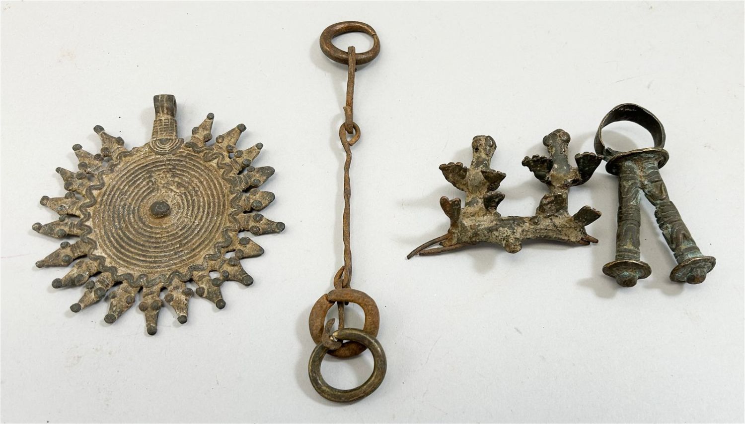 Four (4) cast bronze pendant, ring, figures, various cultures, Burkina Faso and Mali, West Africa. Approximate size, 4.25" x 4" (largest).