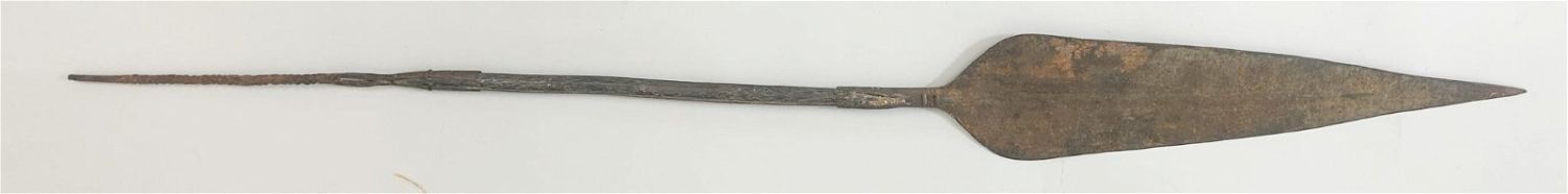 Forged iron currency blade, with wood shaft and wrought iron base, Kuba peoples, Democratic Republic of the Congo, Central Africa. Approximate size, 41.75" long.