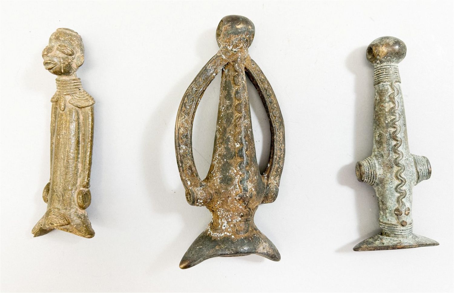 Three (3) cast copper alloy whistles, various cultures, Burkina Faso, West Africa. Approximate size, 5.25" length (largest).