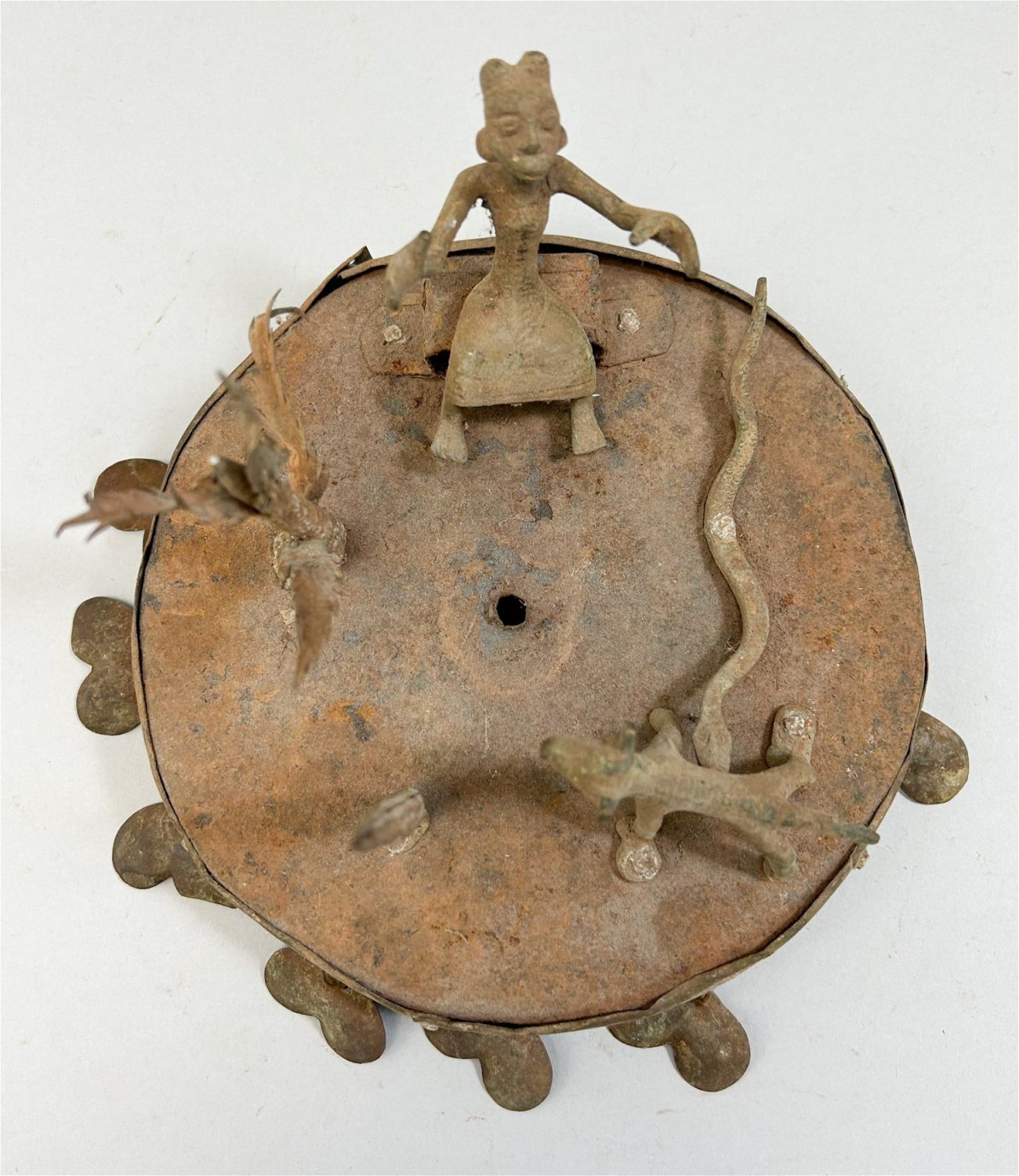 Asen alter staff, wrought iron, with cast bronze figures, made using lost wax method, including a snake and dog, likely C19th or early C20th, Fon culture, Republic of Benin, West Africa. Approximate sixe, 7" diameter.