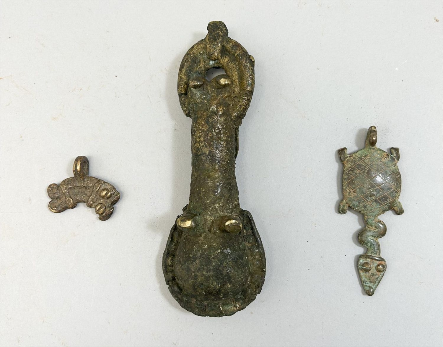 Three (3) items, including two (2) copper alloy Lobi pendants from Burkina Faso, and a cast metal Ofo from Nigeria, West Africa. Approximate size, 5.75" long (largest).