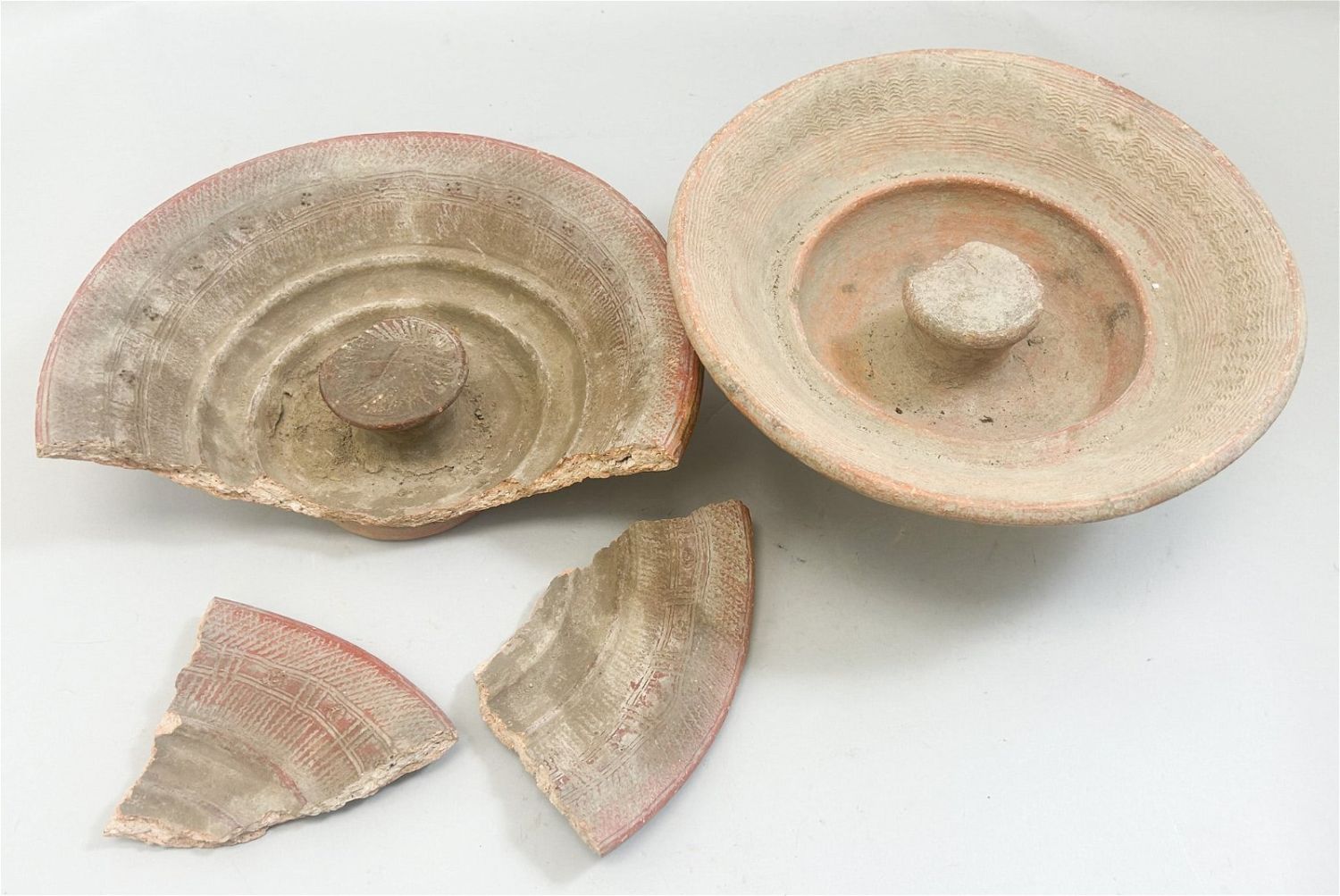 Two terracotta wash basins, possibly Bozo peoples, one intact and the other in fragments, Mali, West Africa, both 12" diameter