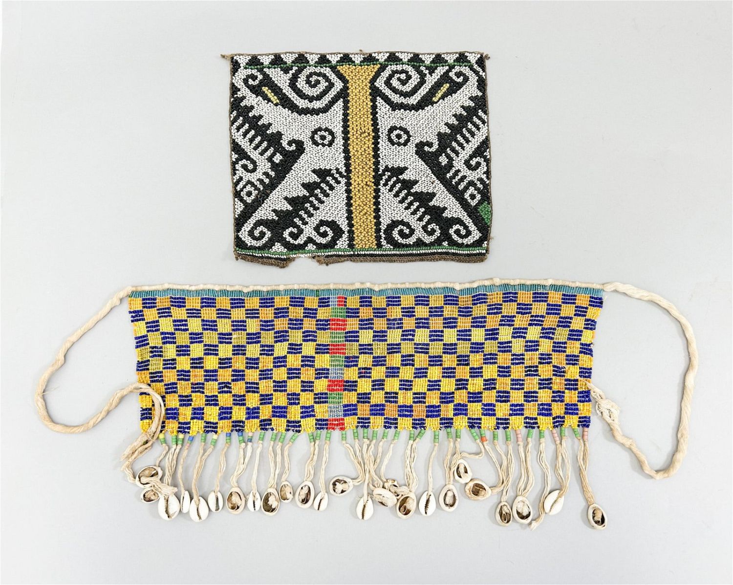 Beaded panel and beaded cache-sex, Cameroon, West Africa, latter with cowries, 15" x 5" (cache-sex, excluding cowrie adornments and ties) and 8" x 9" (beaded panel)