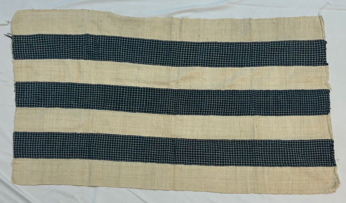 West African strip cloth textile, alternating strips of natural colored and blue checkered cloth. Unidentified culture. Likely mid-20th century. 39" x 51"