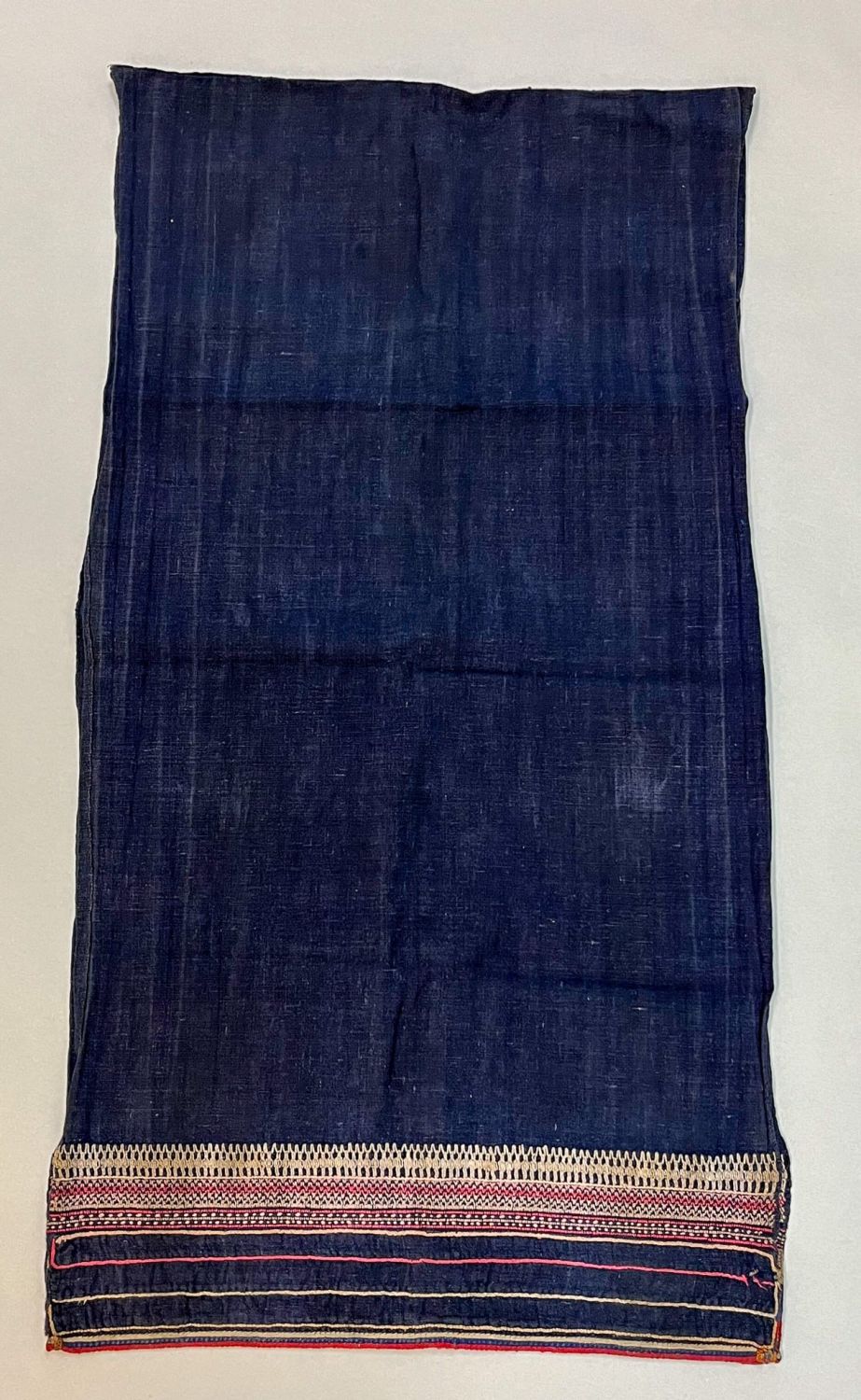 Miao People, Southwest China, vintage woven cotton wrap, indigo, with red, blue , white applique stripes, assorted color embroidery accent, 73"l x 19"w