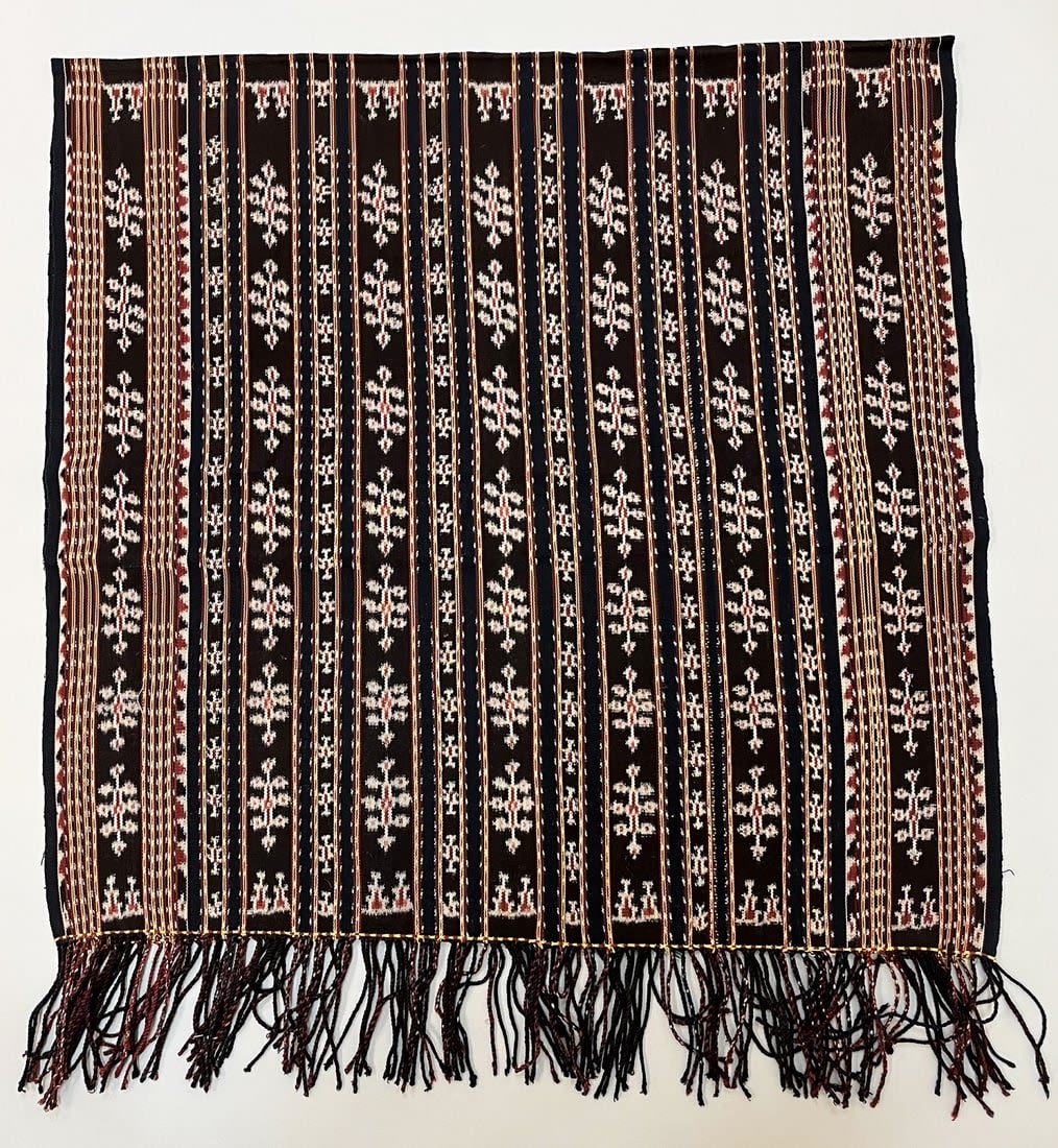 Sawu, Indonesia, vintage woven ikat sarong, indigo ground with rust, yellow stripe and traditional pattern, 60"l x 30"w