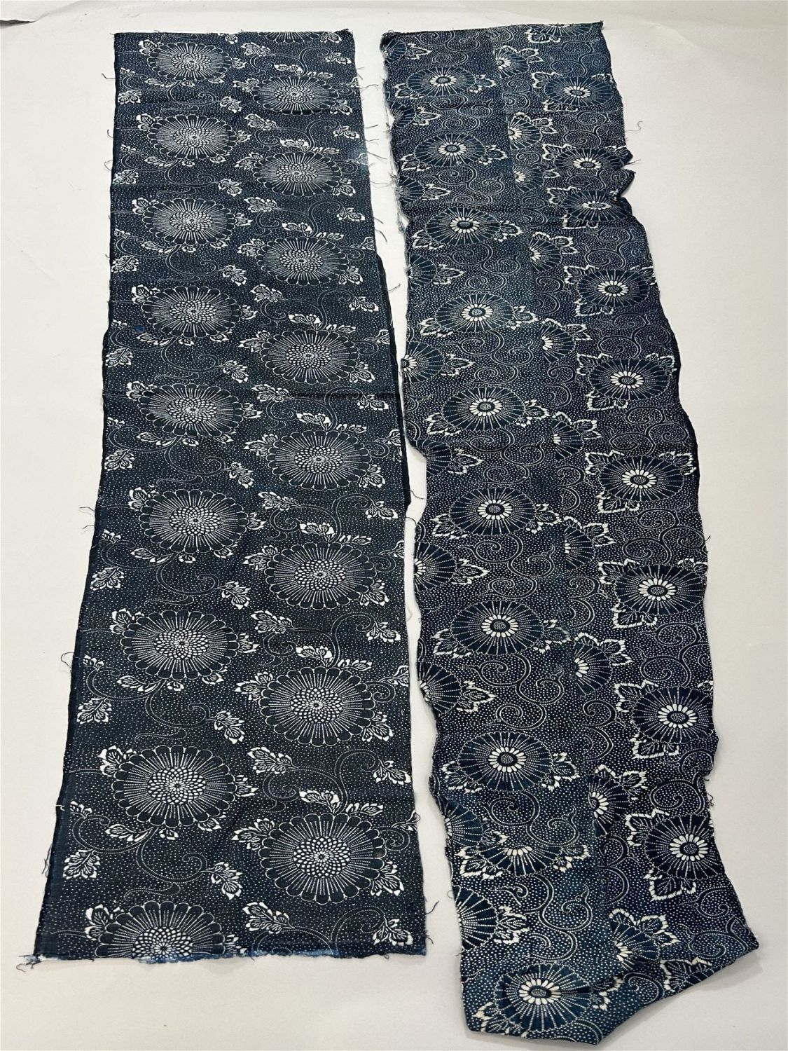 Group of (2) Japan Indigo Stencil Batik Cotton Textile, largest 72"l x 12"w and smallest 64"l x 12.5"w